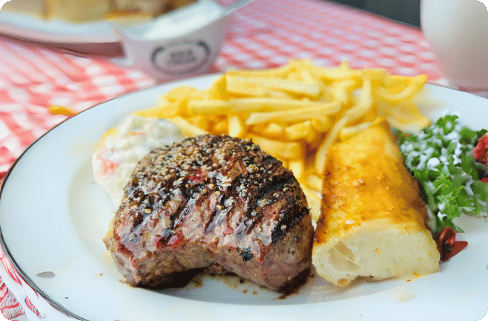 3 pounds of assorted meats (1 pound each of brisket, sausage, and ribs) / 2 quarts of side dishes / served with pickles, onions, bread, and sauce.